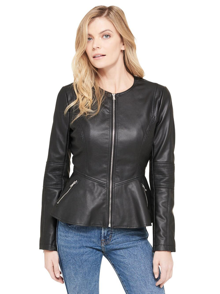A season-right hue and peplum hem make this Designer Brand jacket a current obsession. Ultra-soft faux-leather teams with perforated and stitched detail in a collarless design for a wow factor to send the look soaring.